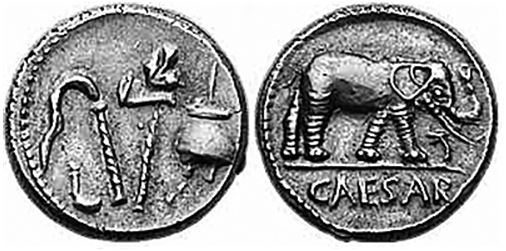 Сам Гай Юлий отдал предпочтение легенде о происхождении своего «когномена» от побежденного доблестным предком карфагенского слона, даже увековечив последнего на монете, отчеканенной в честь своей высадки во главе римских десантных войск в Британии в 54 году до Рождества Христова.