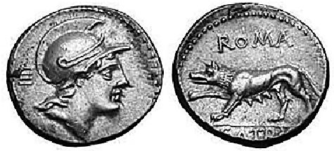 Богиня-персонификация Рима – Рома – и Капитолийская волчица на римской монете
