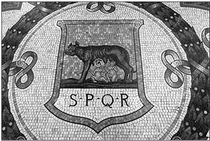 Капитолийская волчица с близнецами и девизом S. P. Q. R на мозаике