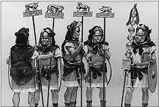 Знаменосцы носили поверх шлемов и доспехов шкуры хищных зверей – волков, медведей иль львов (в подражание легендарному эллинскому герою Гераклу, превращенному римлянами, при посредстве этрусков, в солдатского бога Геркулеса). Впрочем, довольно об этом…