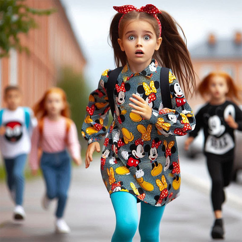 Мама стала ругать за забытые ключи, а я впервые в жизни не расстроилась из-за её ругани. Что же ждёт в школе? Схватила ключи и молнией побежала домой. Дома колгот больше не было… Я схватила первое, что нашла, – яркие голубые лосины. Раньше в таких все ходили, но не в школе. Для школы это слишком кричаще, никак нельзя. Лосины не сочетались со строгим коричневым платьем, и я добавила к ним то первое, что смогла найти, – короткое полосатое платье с Микки Маусом.