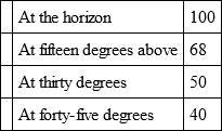 The sun appears to us, when in its zenith, smaller than when at fifteen degrees below; at thirty degrees below the zenith it will appear still larger than at fifteen; and finally, at the horizon, its size will seem larger yet; so that its dimensions in the lower heaven decrease in consequence of its elevations, in the following proportions: