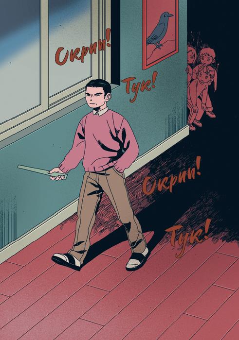 Его вечные спутники – скрипучие сланцы и тридцатисантиметровая линейка – стали практически продолжением учителя. При каждом шаге чёрные сланцы отвратительно скрипели. А ещё он частенько стучал по стене линейкой в такт ходьбе. Получался такой безобразный звук: