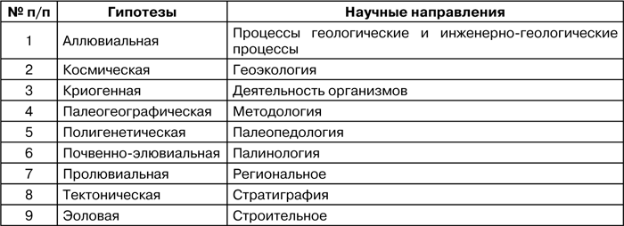В табл. 2.1 перечислены основные гипотезы, каждая из которых по-своему трактует генезис лессовых образований; указаны также научные направления, в которых работали ученые Советского Союза, занимавшиеся изучением лессовых пород.
