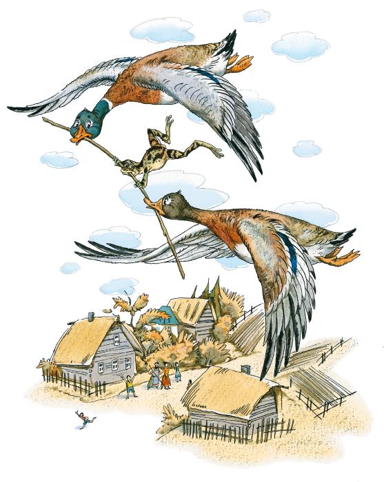 Хотя молчать и тащить хотя бы и лёгкую лягушку три тысячи вёрст не бог знает какое удовольствие, но её ум привёл уток в такой восторг, что они единодушно согласились нести её. Решили переменяться каждые два часа, и так как уток было, как говорится в загадке, столько, да ещё столько, да полстолько, да четверть столько, а лягушка была одна, то нести её приходилось не особенно часто.