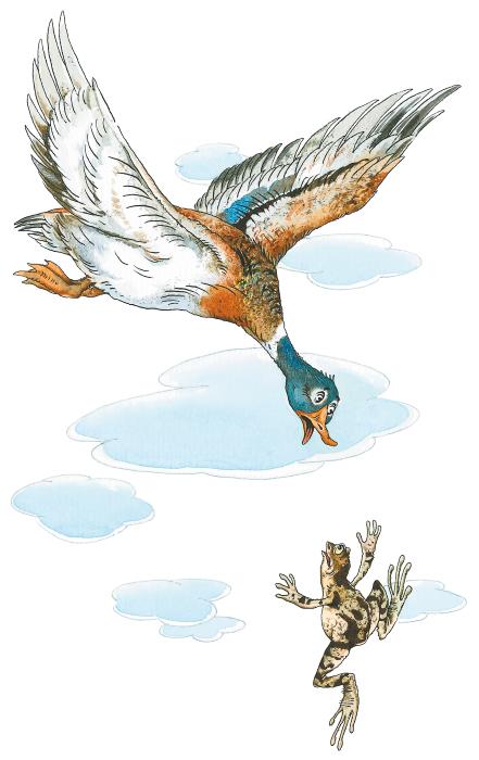 И с этим криком она полетела вверх тормашками на землю. Утки громко закричали; одна из них хотела подхватить бедную спутницу на лету, но промахнулась. Лягушка, дрыгая всеми четырьмя лапками, быстро падала на землю; но так как утки летели очень быстро, то и она упала не прямо на то место, над которым закричала и где была твёрдая дорога, а гораздо дальше, что было для неё большим счастьем, потому что она бултыхнулась в грязный пруд на краю деревни.