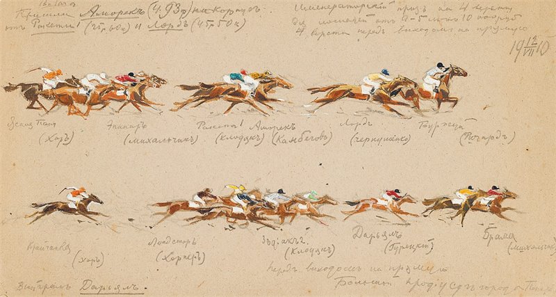Я много рисовал „от себя“ – по памяти. Часто после того, как я „зарядился“ рассматриванием лошадей, я сам мчался, как конь, чтобы скорее зафиксировать виденное. Зрительная память развивалась очень быстро при подобных упражнениях. Смотреть, наблюдать я мог по несколько часов, не проронив ни слова» [7].