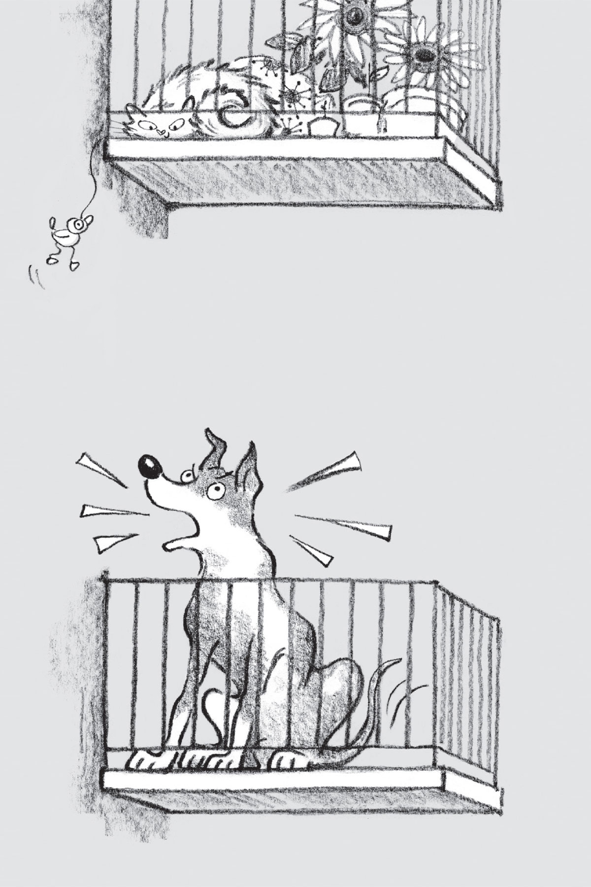 I’ve invented a hilarious new game to annoy him. I sit in a position so that I can hang my tail down through the railings and give it a little twitch to attract his attention. He can see but cannot reach. He barks loudly. I give my tail another wiggle. Buster jumps up, his barking building to an absolute frenzy, but still I am out of reach.