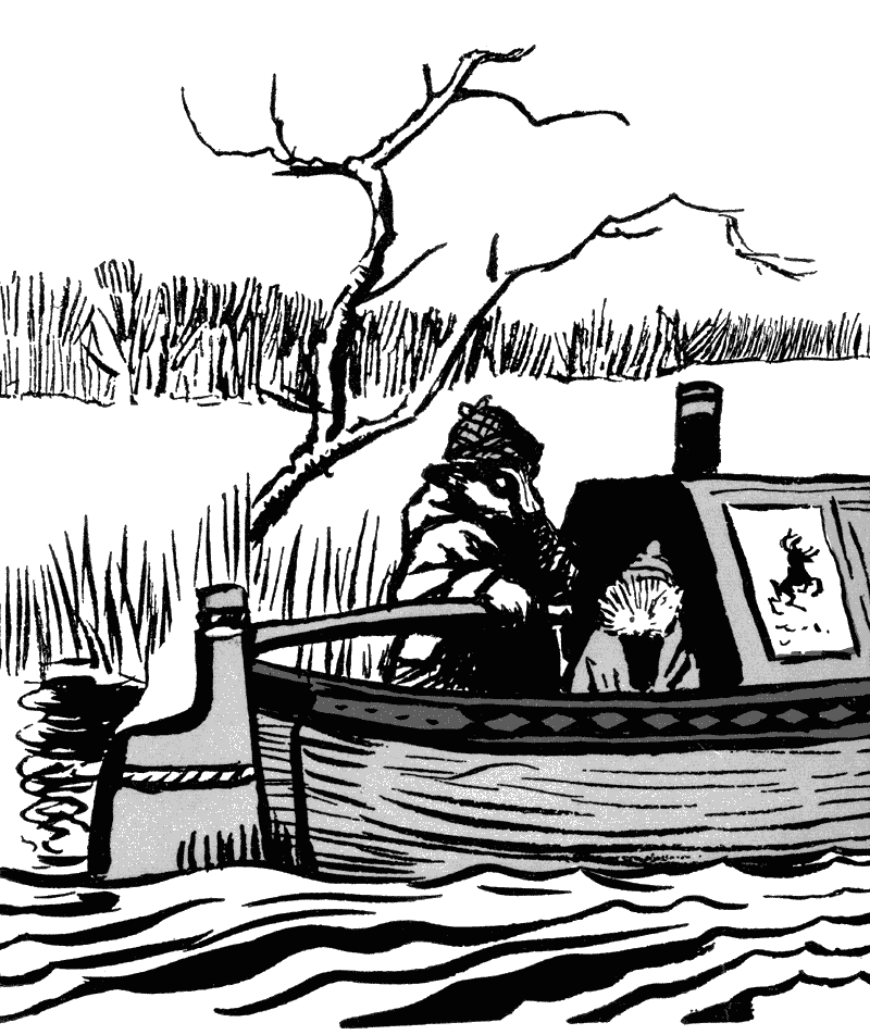 Чёрные и певчие дрозды уже устраивались на ночлег, с ужасом думая о наступающей ночи, морозной и тёмной: они круглыми тёмными шариками выделялись на переплетающихся ветвях деревьев. Тяжело жилось в такую погоду всем животным, которые были не столь удачливы, как дядюшка Билл и его друг Буззи-Пуззи – барсук и ёж, по крайней мере, жили на благоустроенной барже и спали на настоящих койках, их кладовая была набита припасами, а печка согревала холодными ночами и создавала в каюте уютную домашнюю атмосферу.