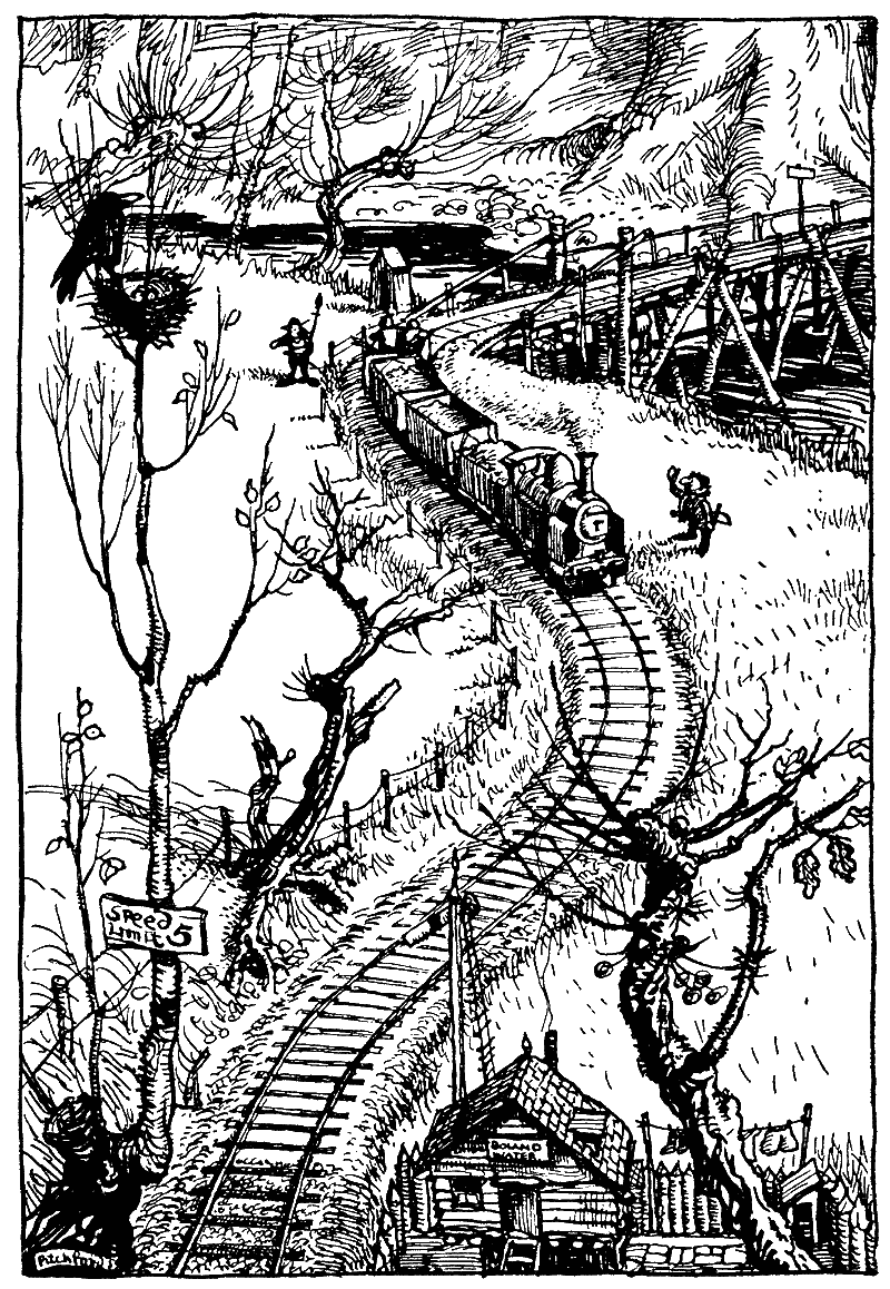 Гномы построили тендер (специальный вагон с дровами, которые закладывали в топку паровоза) и три крепких вагона для перевозки грузов. Затем они стали укладывать железнодорожное полотно, на что тоже ушло довольно много времени. В день они укладывали не более шести дюймов[7] пути. Ещё им пришлось построить железнодорожный мост через Боланд, и это заняло больше времени, чем все предыдущие работы вместе взятые: река была глубокой, а мост надо было сделать довольно прочным, чтобы он мог выдержать весенние паводки. Как видно на картинке, это была целая эстакада на деревянных опорах, похожая на один из тех старинных мостов, которые строили американцы, прокладывая первые железные дороги в годы освоения Дикого Запада.