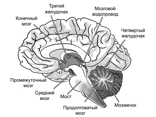 Рис. 1.2. Схема продольного среза головного мозга человека. Показаны шесть отделов головного мозга, две крупные полости внутри него – третий и четвертый желудочки, а также соединяющий эти полости канал (мозговой водопровод)