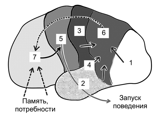 На рис. 1.3 в упрощенном виде изображены основные информационные потоки, которые распространяются по нашей коре больших полушарий, когда мы что-то делаем. А мы практически все время совершаем те или иные действия.