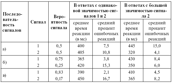 В экспериментах с одинаковой значимостью сигналов 1 и 2 (первая серия) время реакции на сигнал и доля ошибочных реакций оказались большими на маловероятный (редкий) сигнал и меньшими на высоковероятный (частый) сигнал.