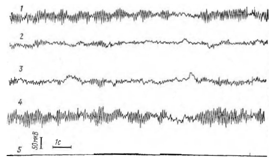 Обозначения: 1 – запись затылочной области, 2 – сенсомоторная область левого полушария, 3 – сенсомоторная область правого полушария, 4 – теменно-затылочная область, 5 – отметка раздражителя: первая отметка – предупреждающий сигнал (звук), вторая – пусковой стимул (свет)