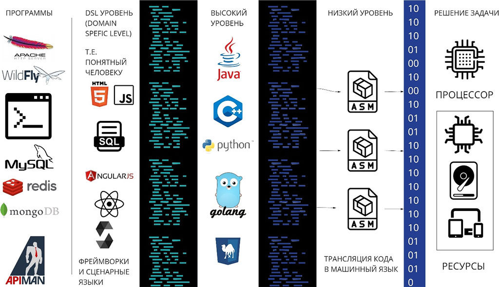 Для этого появился специальный инструмент и язык Assembler, который переводил программу в машинный язык. Он кодирует все сигналы в 0 и 1, чтобы ваша машина могла понять, чего вы от нее хотите. Раньше все программы писались на assembler’e. У каждого процессора свой диалект assembler’a, как у жителей разных стран. Программа написанная на assembler’e для одного процессора совершенно не совместима с другим процессором, потому что у него как вы понимаете другое количество транзисторов. Поэтому она не будет просто работать или запускаться. Это, кстати, и означает совместимость программ, когда ваши итишники говорят, вам что эта версия несовместима с версией вашего оборудования и нужно потратить тонну денег на миграцию, то это означает, что программа на ваших процессорах просто не запуститься и нужно ее фактически переписать. Все это было круто, но оказалось, что писать на ассемблере очень сложно, хотя и эффективно. Вы можете напрямую управлять памятью вашего устройства, порядком обработки команд и т.д.