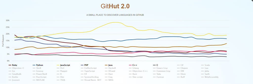 В принципе написать можно все что угодно. Если смотреть на нашу пирамиду, то фактически все известные системы и технологии, например офис, игра “Wolfenstein 3D” или какой-нибудь текстовый редактор были написаны на языках высокого уровня. Когда они появились, мир пошел по пути абстракции, то есть пытаться абстрагироваться от сложной логики машинного уровня, до каких-то простых вещей. Это дало рывок, и все начали писать свои программы, мир захватила лихорадка собственной разработки. На этом начинает строительство наша пирамида технологий. Каждый язык высокого уровня, обладает своими правилами, синтаксисом, инструментами и возможностям. Если посмотреть статистику за 2020 репозитория GIT, это то место, где хранят свой код 90 % всех разработчиков (по – моему мнению). То статистика, следующая: