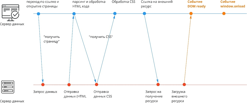 1. Сначала ваш браузер запрашивает код страницы (HTML код) у сервера (это тот компьютер, на котором лежит страница)