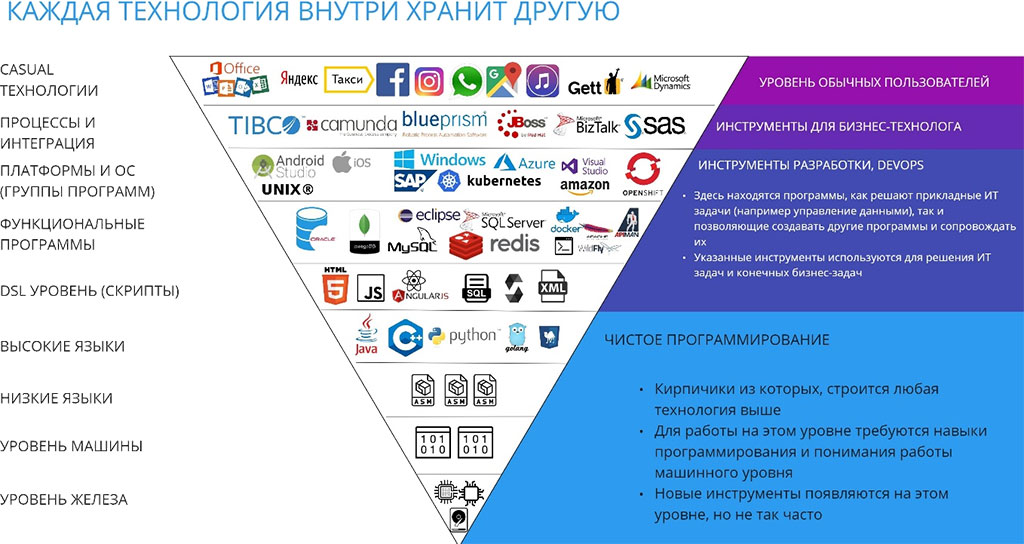 Каждый слой такой пирамиды основывается на предыдущих слоях, и представляет собой уровень абстракции. Как видите, на определенном уровне появляются базы данных, на каком-то уровне появляются операционные системы и т.д. Чистый программист работает на уровнях до высоких языков программирования. Дальше уже появляются различные фреймворки разработки, появляются такие люди, как DevOps инженеры, которые управляют ИТ системами с помощью других ИТ систем, таких как kubernetes, Amazon, Openshift и т.д. Обычный пользователь живет на самом верху, пользуясь обычными приложениями, например Яндекс такси или оффис. Надо понимать, что каждый такой уровень съедает часть ресурсов машины / времени на перевод команды в формат, команды, который работает на нижнем уровне. Например, Яндекс такси, это работа с базой данных и работа программы на языках Си и Пайтон, которые в свою очередь конвертируются в машинный код. Чем больше уровней абстракции, тем более ресурсоемкая пирамида получится, ведь каждый уровень будет потреблять какую – то часть ресурсов, с другой стороны, вы получите независимость одного уровня от другого. Есть даже отдельный уровень интеграции и управления процессами, где живут такие инструменты, как ВРМ, шина данных, роботизация процессов и т.д. Все эти инструменты дают готовую среду, которая ускоряет процесс разработки и цифровизации процессов. Любая технология требует ресурс, как цветок своего горшка. Если вы решили посадить у себя оранжерею, то придется разориться на кашпо и землю. Конечно, есть компании, кто все старается отдать на аутсорс, вообще всю ИТ функцию, но обычно они плохо заканчивают.
