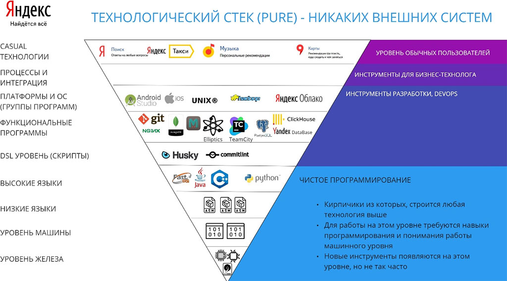 А можно все самостоятельно сделать? Чего нас пугать? Конечно все это можно сделать напрямую через те же языки высокого уровня, вопрос только зачем. некоторые компании, специально исключат у себя такие инструменты, чтобы повысить скорость обработки, ведь каждый уровень, как мы поняли съедает часть времени обработки операции, как своего рода плату за проезд. Так если посмотреть стек Яндекса (я его собирал вручную, изучая всякие материалы в Интернете), то получим следующую картину: