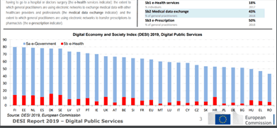 Это очень интересная область. Давайте представим, что государство это цифровая платформа, как большой AppStore со своими услугами, сервисами, приложениями. Представьте, что можно зайти из любой точки мира и воспользоваться любой услугой, что государство незримо присутствует где-то рядом с вами и доступно для взаимодействия 24/7. Никакой бюрократии, потому что государство все все знает о вас, вам не нужно каждый раз копировать данные из одного окошка в другое, нужны никакие справки, потому что государство само договаривается внутри своих департаментов и муниципалитетов. Звучит круто же? А представьте цифровые медицинские книжки, когда мы меняете одну поликлинику на другую и ваша медицинская история не становится заложником этого выбора, а новый врач не смотрит на вас как на чистого младенца, которого принесли из роддома и у которого нет истории. И даже, если вы потеряете все документы, то вы останетесь собой. Сейчас же потеря документов означает фактически выпадение из жизни человека на несколько месяцев. Это и есть просто понимание ценности цифровизации повседневной жизни. Согласно данным DESI за 2019, в Европе довольно высокий уровень цифровизации государственных услуг.