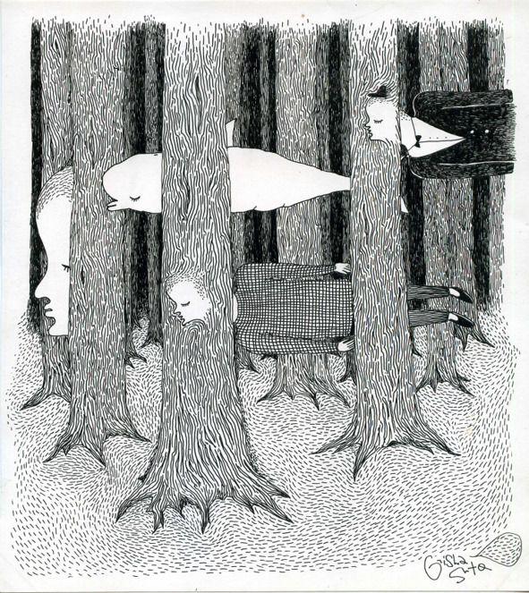 Я огляделся по сторонам и стал погружаться в лес. Вскоре до меня донеслась из-за ветвей внятная и даже какая-то артистичная фраза: «Я чувствую близость друга!» Я заглянул через ветки и увидел на поляне темноволосого парня на вид чуть старше 30 лет, одетого в чёрную ветровку и чёрные джинсы. Он стоял перед пнём, на котором вырос единственный красивый и яркий цветок. «Цветок, – сказал незнакомец, обращаясь к растению и продолжая стоять ко мне спиной, но наверняка чуя моё присутствие на поляне. – Я бы хотел, чтобы ты говорил с моим новым другом на языке музыкальных фраз». Он повернулся ко мне и приветственно подозвал к себе рукой. Когда я подошёл ближе, парень возмущённо вскрикнул: «Где мои стереоочки? Без них мне и лес не мил!» Потом достал из кармана ветровки бумажные стереоочки – те, самые дешёвые, где одна пластинка синяя, другая красная, – и надел их. «Эти цветы похожи на пенисы, – продолжал он, – а норки кротов – на анусы». Мне стало интересно послушать его, и я решил сохранять молчание. К тому же он выглядел вполне прилично, даже симпатично и располагал к доверию. Мы уже шли вдвоём, и этот парень продолжал говорить: «Я никогда не пробовал анусы… Пойдём через ручей, я покажу тебе Лесных Божков». Мы дальше шли по лесу, он снова убрал очки в карман. «Я здесь из-за несчастной любви, – продолжал незнакомец, – я немножко сошёл с ума. Так… самую малость, чтобы стать гением… Думаю, я бы даже мог контролировать свой ум и зарабатывать деньги в офисе… Не очень много, так, тысяч 40—50 в месяц… Но хрящи!» Он стал серьёзным. «Всё дело в них! Растут из моего лица и лба… Лес принимает меня». Мы подошли к низкому оврагу, через который была перекинута довольно узкая доска, а внизу тёк ручей. «Вот мост, – объявил мой спутник. – Иди первый, двоих эта доска не выдержит. Там, за ручьём, они живут…» Я, аккуратно балансируя, пошёл по доске на другую сторону. Когда я почти дошёл, человек, оставшийся на берегу, со всей силы пинком выбил доску так, что и я, и сама доска полетели в ручей. «Ха! – прокричал парень победоносно. – Почему ты вообще решил, что я хороший?» От неожиданности я даже не смог ему ответить. Весь мокрый, я попытался вылезти на противоположный берег. А мой спутник продолжал кричать: «Я чёрный учитель в твоей жизни!» «Полагаю, сравнение цветов с пенисами уже должно было насторожить тебя», – сказал он напоследок, уже успокоившись, и затем исчез в лесу. Я оказался на другом берегу, и пути назад не было.
