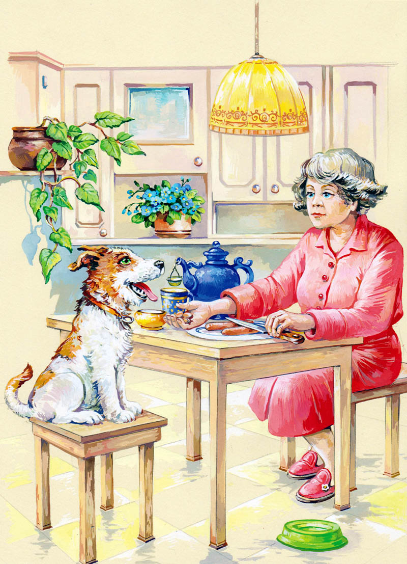 Сосиски были изумительно вкусны, и пёс не выдержал. Он вскочил на стоявший рядом стул, положил передние лапы на край стола и, дрожа от нетерпения, стал следить за действиями кормилицы, мысленно осуждая её: «Ну что ты копаешься, как неживая?! Зачем портишь еду? Я же не птичка, чтобы меня крошками кормить. Кидай все сразу!..».