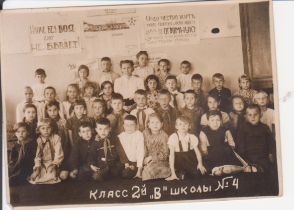 2-й класс «В» школы №4 Тракторозаводского района города Сталинград. Нижний посёлок. 1948 год. В нижнем ряду четвёртым слева сидит пионер Вячеслав Симонов.