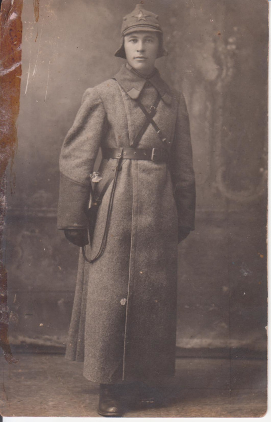 На фотографии 1926 года Вы видите старшего сына бабушки – Дмитрия в форме военного. На воротничке шинели у него три буквы—СПШ. Возможно, (это стрелково – пулемётная школа). На обратной стороне фотографии, которая сделана в городе Ташкент 6 февраля 1926 года Дмитрий пишет, что он служит на далёком Туркестанском фронте командиром взвода с октября 1925 года.