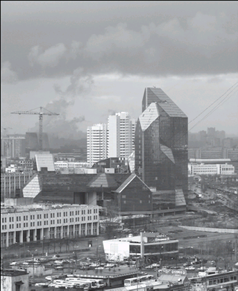 Распространение укатанного асфальта вместо мощения булыжником или кирпичом в начале ХХ в. породило неожиданный эффект – после дождя горизонтальное «зеркало» улиц стало привычным, и сама размытость отражений вечерних огней на обширной поверхности придала романтический оттенок даже заурядному днем городу. В 50-е годы архитекторы всего мира полюбили изображать перспективы проектируемых зданий в именно таком отражении, и эта мода стала угасать только с того момента, когда у воды и асфальта появился мощный конкурент – стекло. Модернисты 20-х годов только мечтали о домах, похожих на стеклянные призмы, но с середины столетия их мечты обратились повальной модой, не угасшей до сих пор, хотя и несколько поблекшей. Теперь город обзавелся множеством огромных вертикальных зеркал, которые, к тому же, нередко оказались поставлены одно против другого, что создает фантасмагорию, разрывая давнюю солидность городских улиц. Более того, приставив зеркало фасада напротив старинного здания, стало возможно использовать его отражение, для того чтобы обогатить образ более чем скупой «коробки» офиса. В свою очередь архитектура «хайтек», поставив себе на службу высокие технологии, с 80-х годов начала использовать «мятое» стекло, стекло с усиленным блеском, за счет тончайших защитных пылеотталкивающих пленок на его поверхности. Более того, освоив нарезку и полировку тонких и очень больших плит естественного камня, архитекторы начали ставить приглушенного блеска зеркала приставных фасадов, крепящихся к каркасу с помощью сложных конструкций. Наконец, к этому добавился все чаще зеркальный блеск стальных конструкций, пока, наконец, от эффекта калейдоскопа, дополненного все чаще ярким цветом, не устали, и количество зеркал в городе не начали в последнее время сокращать.