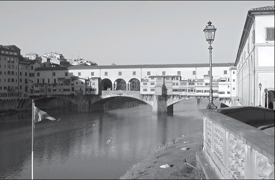 С этого момента начинается великое состязание городских мостов. Их расчищают от зданий, лишая живописности, но зато открывая сразу две возможности: восхищение смелыми формами моста, воспринимаемыми с воды или с берега, исполненное критики любование панорамой обоих берегов, открывающейся при взгляде с середины моста. Таков галерейный мост через реку Арно, по самой середине которого есть огромное окно, специально устроенное для того, чтобы прохожий мог остановиться и взглянуть на город.