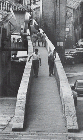 Почти всякая главная улица рано или поздно пересекает реку, преобразуясь в мост. Мосты сложно возводить, они всегда обходились дорого и ценились чрезвычайно высоко, являя собой нередко предмет гордости горожан. Более двух тысяч лет исправно служит жителям Рима мост Фабриция – два широких кольца каменной кладки, соединенных вместе. Их верхняя половина поднимается высоко над Тибром, а нижняя скрыта под его дном, обеспечивая целому чрезвычайную устойчивость. Перейдя от деревянных мостов к каменным, жители средневековых городов не могли смириться с тем, что зря пропадает столько драгоценного места, и застроили свои мосты домами, пропустив движение под ними. Наряду с большими мостами во множестве возводились малые – через речки, каналы и ручьи, мосты проездные и мосты пешеходные, прямые и горбатые. Мост повсюду стал непременным элементом городской среды, войдя в реестр крупнейших монументов. Ценность моста взывала к тому, чтобы придать ему индивидуальный архитектурный облик и с наступлением Ренессанса, в результате конкурсного состязания, через Большой канал Венеции отважной аркой был перекинут мост Риальто, а его автор Антонио получил прозвище Даль Понте – так сказать, Антонио Мостовой.