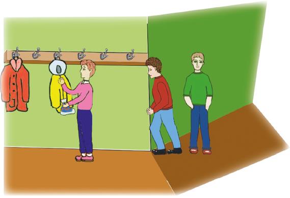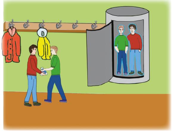 «В чём шутка, тайны столько!Старик серьёзным был?» —Недоумённо КолькаРуками разводил.Они вошли в кабинкуПроизнесли слова.Внезапно всё поплыло,И кругом голова.И вдруг друзья увиделиСебя со стороны —Как шапку в раздевалкеПрипрятали они.«Старик просто волшебник!И это в наши дни?Не может быть такого!» —Не верили они.Но шапку в чей-то шкафчикПриткнули эти двоеИ быстро удалились,Довольные собою.В сомненьях из кабинкиРебята выходили,Достали шапку Ленки —На место положили.