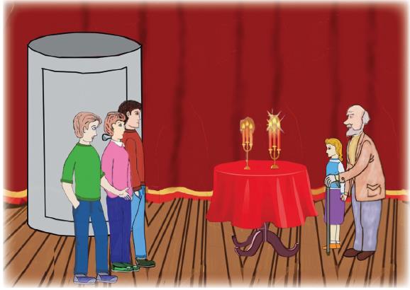 «Зайти надо в кабинкуИ громко там сказать:“Верните нас – мы будемОшибку исправлять”».Старик вздохнул и дальшеПродолжил наставлять:«Окажетесь в том месте,Где можно изменять.В кабинке никому выНе слышны, не видны,Но выходите, лишь когдаОстанетесь одни.Старайтесь пошустрее,Исправить ту ошибку,Вернитесь побыстрееНазад, в свою кабинку.