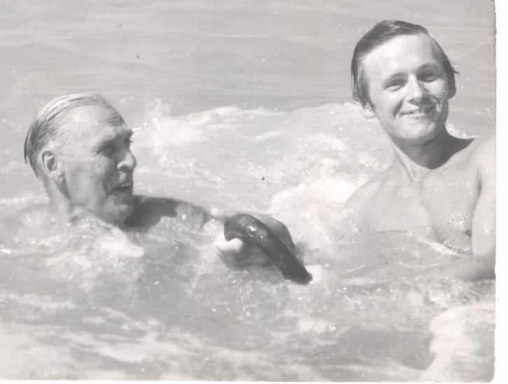 На что мальчик уверенно ответил, что не боится, что уже нырял. Павел подумал, что, пожалуй, и сможет. Вспомнил себя в пятом классе, как учительница физкультуры в жаркий день начала сентября привела их в динамовскую купальню на берегу Даугавы. Павлик увидел вышку для нырянья с площадками на высоте 3, 5 и 10 метров. Проплавал саженками, на боку, на спине, а потом решил нырнуть с трех метров. Нырнул солдатиком, потом поднялся на пятиметровую, посмотрел вниз – далеко, очень далеко, вода еле видна, страшно. Прыгать не стал, но не застыдился перед классом, смотревшим на него. И тут одноклассник Олег Иозенас смело взбегает на десятиметровую площадку и решительно бросается ласточкой с нее. Павел восхищен, класс восхищен, учительница встречает его на мостках и ругает – как он посмел без ее разрешения, но все видят, что ругает она его понарошку, что тоже восхищена и гордится им.