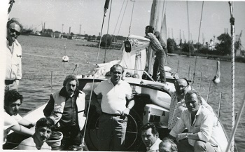 На яхте, 25 лет окончания РПИ. Слева стоит Влад Зильберман, ниже Гарик Портнов, Ханан Раскин, Наум Брод, Рудольф Суржиков, Коля Летунов, голова Вовы Сорокина, Юра Брамник, Модрис Дузелис