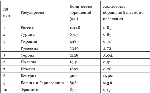 Таблица 1.1. «Антирейтинг» государств-лидеров по количеству обращений их граждан с жалобами в межгосударственный орган по правам человека, переданных в судебный орган (за 2018 год) 9