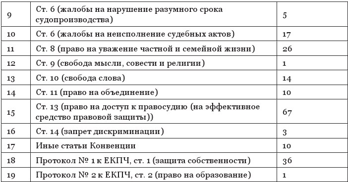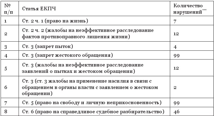 Таблица 1.2. Статьи Конвенции о защите прав человека и основных свобод, нарушенные властями РФ (в соответствии с постановлениями ЕСПЧ, 2018 г.) 11