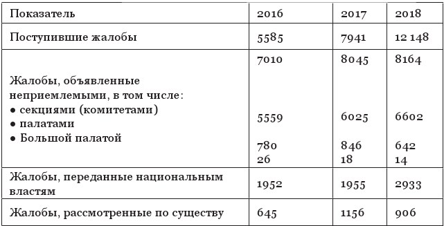 Так, по данным издания «Газета «Деловой Петербург», в 2018 г. в ЕСПЧ поступило 12 148 надлежаще оформленных жалоб от граждан РФ, что в полтора раза больше, чем в 2017 г. (7957). Для сравнения, в 2016 г. их было всего 5587, т. е. за трехлетний период рост составил около 150%. Данный массив охватывает правильно оформленные документы, в принятии которых не отказано по формальным основаниям. Вопрос об их приемлемости будет решен после их изучения по существу7.