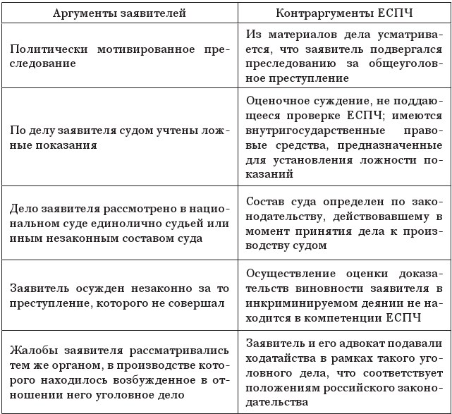 Таблица 1.5. Аргументы заявителей, наиболее часто не признающиеся ЕСПЧ убедительными