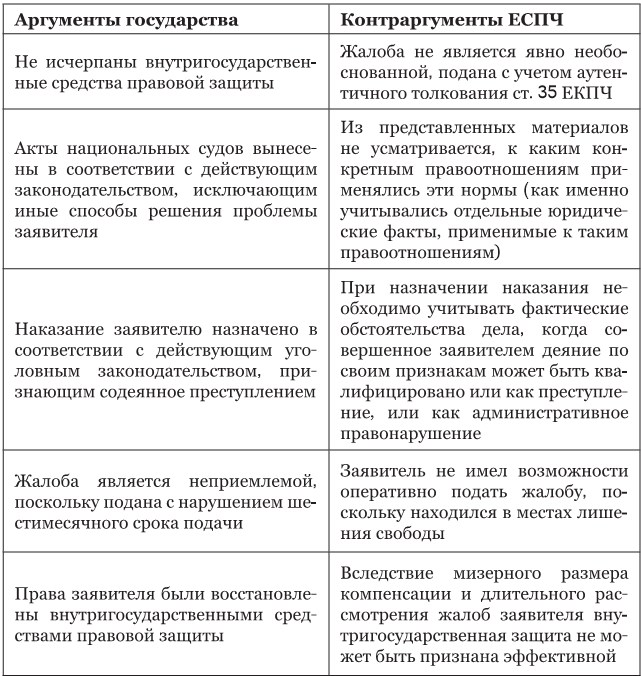 Из приведенных в таблице сведений можно заключить, что аргументы представителей государства, не мотивированные подробной информацией, связывающей применение конкретных правовых норм с делом заявителя, ЕСПЧ не учитывает, хотя и подвергает критическому анализу. Иными словами, при рассмотрении жалобы государство является стороной состязательного процесса, на которую распространяется обязанность доказать все обстоятельства, на которые она ссылается. Государство-ответчик может предложить в одностороннем порядке внесудебное урегулирование спора, направив в суд соответствующее заявление (такой прием практикуется в случае, когда законодательный дефект, нарушение конвенционных норм правоприменительными решениями или невозможность приведения контрдоводов являются очевидными). ЕСПЧ отвергает доводы о несоблюдении сроков подачи жалобы, оставляя решение этого вопроса на собственное усмотрение. Это внешне может восприниматься негативно, однако в действительности соответствует ст. 35 ЕКПЧ и общим принципам, определяющим его статус как межгосударственного органа по защите прав человека. ЕСПЧ критически оценивает длительность производства по внутригосударственным жалобам заявителя, полагая ее виной государства (что, кстати, не исключает возможности контраргументации, связанной с существенной загруженностью российских судов, общим количеством рассматриваемых ими дел и особенностями определения территориальной подсудности). ЕСПЧ в большинстве случаев считает незначительными присужденные в качестве компенсации морального вреда суммы, и в ряде случаев это полностью справедливо (когда назначается компенсация в пределах нескольких тысяч рублей лицам, подвергавшимся противоправным действиям со стороны правоохранительных органов).