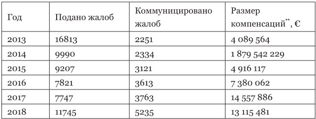 Из приведенных данных видно, что за истекший период времени количество приемлемых жалоб существенно выросло: если в 2013 г. их было около 12,5% (каждая восьмая), то в 2018 г. – уже порядка 48% (практически каждая вторая). Размер присужденных компенсаций претерпел существенные изменения, но в последние два года наметилась тенденция к его снижению.