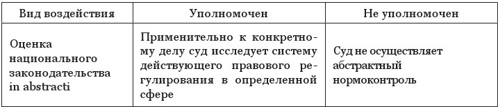 Следует отметить, что компетенция ЕСПЧ не является всеобъемлющей, и его решения не обладают императивной юридической силой, т. е. не обязывают государство принимать изменения в действующее законодательство. В так называемых «пилотных постановлениях»18 суд может определить предпочтительные направления модернизации национального законодательства, но только если им выявлены системные нарушения конвенционных норм (например, в отношении России такое постановление вынесено в 2012 г. применительно к изменению условий содержания в местах изоляции от общества, поскольку ЕСПЧ пришел к выводу о том, что они создают предпосылки для бесчеловечного обращения и унижения достоинства). Однако конкретные сроки, объем и содержание вероятных изменений правового регулирования суд не определяет. Осуществляя рассмотрение жалобы заявителя, он оценивает нарушение конвенционных норм по конкретному делу. Схематично компетенция ЕСПЧ в части воздействия на национальную правовую систему может быть представлена, как показано в таблице 1.7.