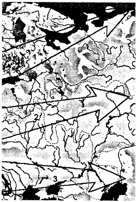 1. Но вот солнечная деятельность усилилась, ложбина циклонов сдвинулась к северу и проходит над Францией, Германией, Средней Россией и Сибирью. Тогда сохнут степи, мелеет Балхаш и Арал, набухает Каспийское море, Волга превращается в мутный, бурный поток. В Волжеско-Окском междуречье заболачиваются леса, зимой выпадают обильные снега и часты оттепели; летом постоянно сеет мелкий дождик, несущий неурожай и болезни.