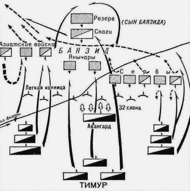 Битва началась с восходом солнца. Перед позициями армии Тимура выстроилось тридцать индийских боевых слонов – «танков Средневековья», которые могли смутить и обратить в бегство противника, никогда с ними не сталкивавшегося ранее. Первый удар войск Тимура пришелся по левому флангу Баязида, где дрались сербские дружины. Сербы держались стойко. Тогда Тимур нанес удар по правому флангу, где стояли полки из бывших бейликов Сарухан, Ментеше и Гермиян, не так давно присоединенных к Османскому государству. Бой был длительным и упорным, но в конце концов Тимуру удалось заставить турок отступить. Дольше всех продержались янычары под командованием самого султана. Когда почти все они были перебиты, Баязид попытался спастись бегством, но был схвачен врагами. Вместе с ним попал в плен и один из его сыновей – Муса. Как пишут современники, могущественного и непобедимого прежде османского султана Тимур возил за собой в железной клетке. Турецкий историк конца XV в. Нешри писал, что победитель приказал соорудить для Баязида «паланкин наподобие клетки», который везли между двух лошадей впереди самого Тимура, а на привалах устанавливали перед его шатром. По преданию, когда Баязид узнал, что Тимур собирается увезти его в Самарканд, он отравился.