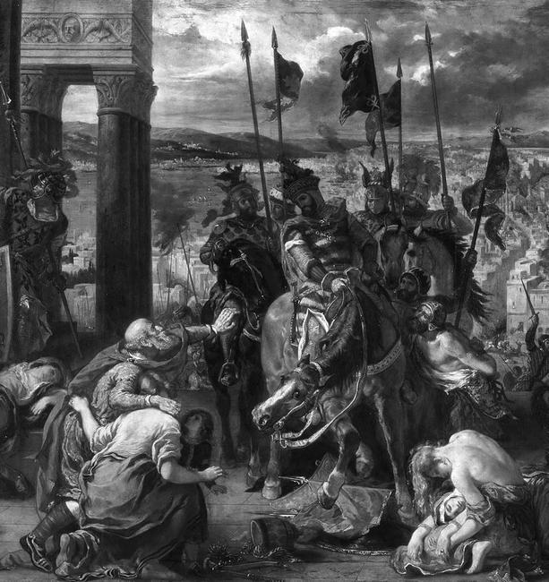 Крестоносцы в Константинополе. Картина Делакруа. 13 апреля 1204 года Константинополь захватили рыцари Четвертого крестового похода. Они сожгли и почти полностью разорили столицу Византийской империи. На ее территории западные завоеватели создали Латинскую империю, в которой экономическое господство перешло к венецианским купцам. Но в 1261 году византийцы, поддержание генуэзцами, отвоевывают Город, и воссоздают Византийскую империю под властью династии Палеологов