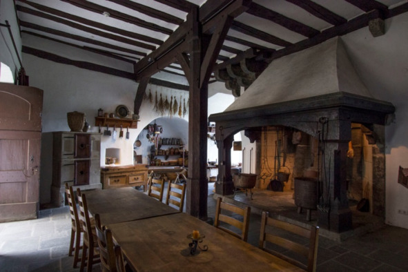 Кухня была на самом нижнем этаже замка, а через стенку находилась тюрьма. В центре кухни стояла печь, на которой на вертеле жарилась тушка свинины. Рядом с печью сидела Зельда-девушка семнадцати лет. Напротив нее сидел юноша и помогал ей крутить вертел.