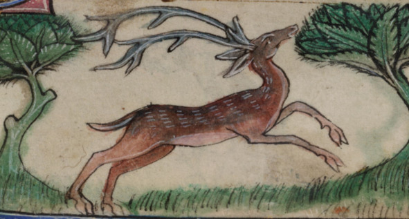 Фалберт пустил стрелу, но она лишь пролетела рядом с оленем. Неожиданно стрелу метнул Эуген, и олень свалился.