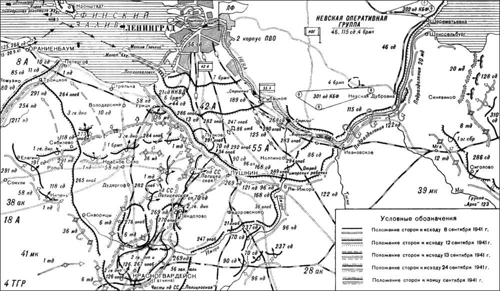 Что касается сил, которые непосредственно осуществляли оборону Ленинграда, то с юга и запада ее осуществляли 8-я армия Ленинградского фронта, сформированная 24 августа на основе управления 50-го стрелкового корпуса, 42-я армия и Красногвардейский укрепленный район. Краткая характеристика этих сил будет дана далее.