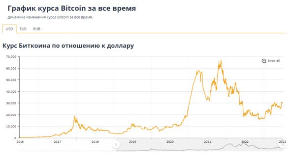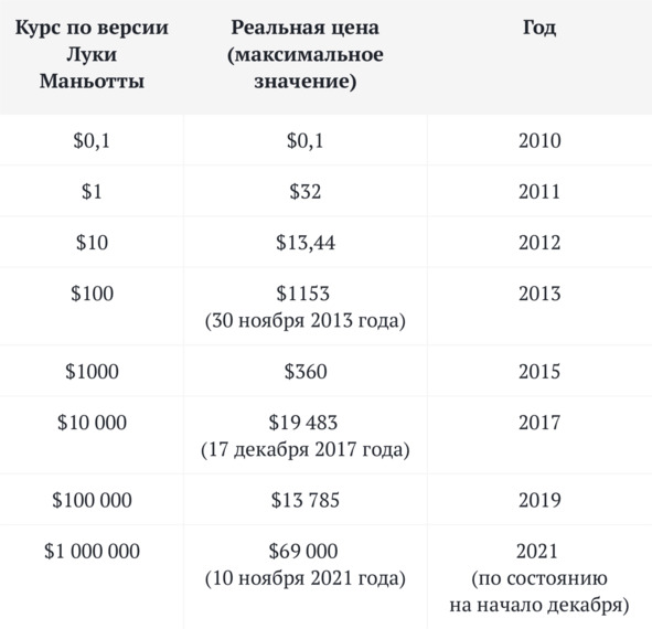 Каждый год цена на биткоин в среднем росла в 10 раз. От 0,1 доллара в 2010 году до 1 доллара в 2011 году, затем до 10 долларов в 2012 году и до 100 долларов в 2013 году. Затем рост немного замедлился – стоимость увеличивалась в десять раз каждые два года: до 1000 долларов в 2015 году, до 10 000 в 2017 году, до 100 000 в 2019 году и до 1 000 000 в 2021 году.