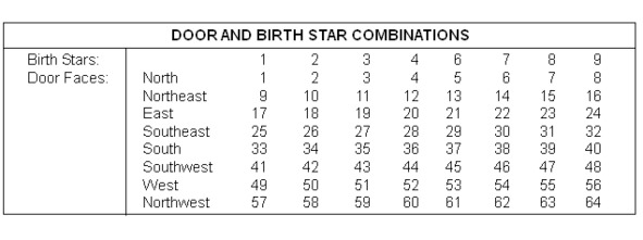 Используйте приведенную ниже таблицу комбинаций дверей и звезд рождения и найдите свое состояние, указанное числом, где встречаются горизонтальный столбец Двери и вертикальный столбец Звезды. Например, если ваша дверь смотрит на восток, а число вашей звезды рождения равно 6, вы должны прочитать параграф 21 в последующих предсказаниях.